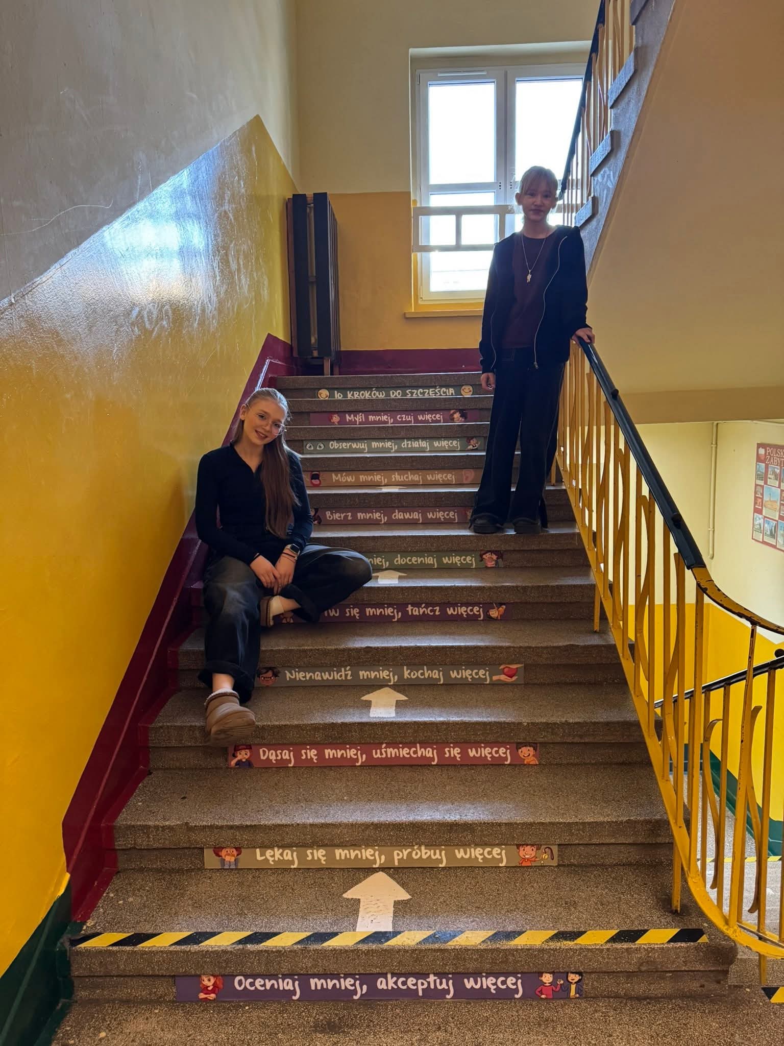 Samorząd uczniowski działa. Aby nasza szkoła stała się bardziej kolorowa i przyjazna, zakupiliśmy naklejki na schody. Są one nie tylko estetyczną ozdobą, ale również zawierają ważne treści edukacyjne i życiowe.