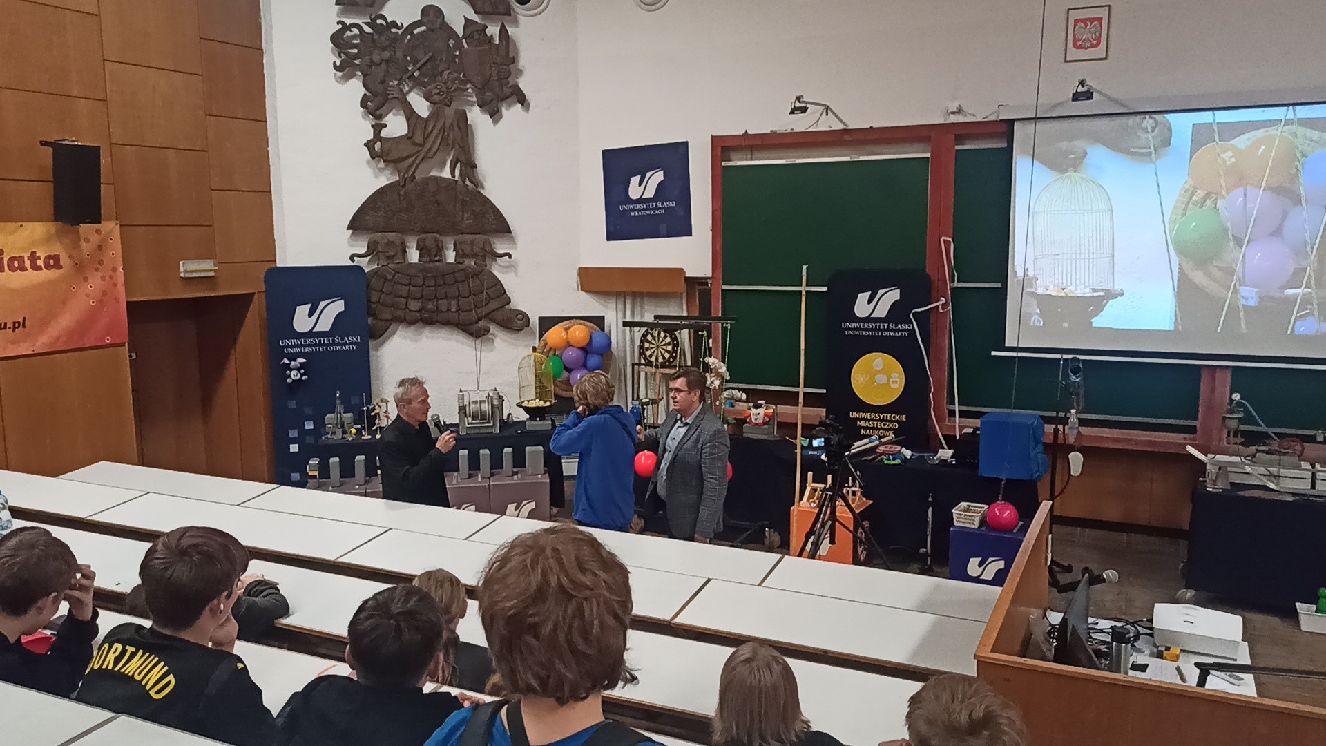 Klasy 8 odwiedziły Uniwersytet Śląski w Katowicach. Nasi uczniowie wzięli udział w zajęciach "Osobowości Świata Fizyki" .Ciekawe wykłady były pełne wspaniałych eksperymentów. Na koniec zwiedziliśmy wystawę maszyn liczących oraz iluzji optycznych.